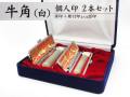 牛の角を加工した印材です。天然の飴色が美しく、その中でも黒い筋の入らない希少な印材です。天然の色をそのまま使用しているため、印材によって風合いに個体差があります。粘り気が強く摩耗しにくい素材です。